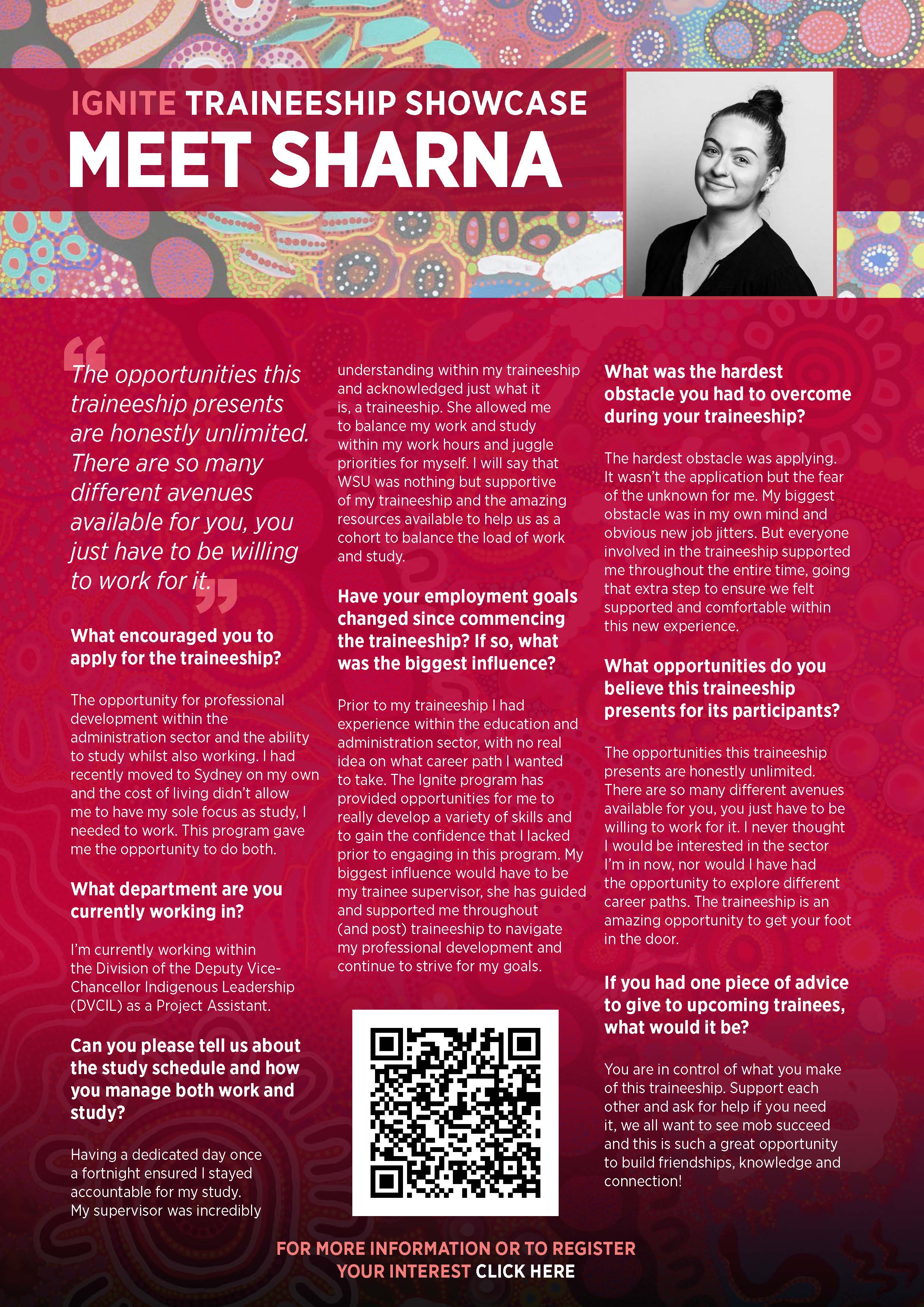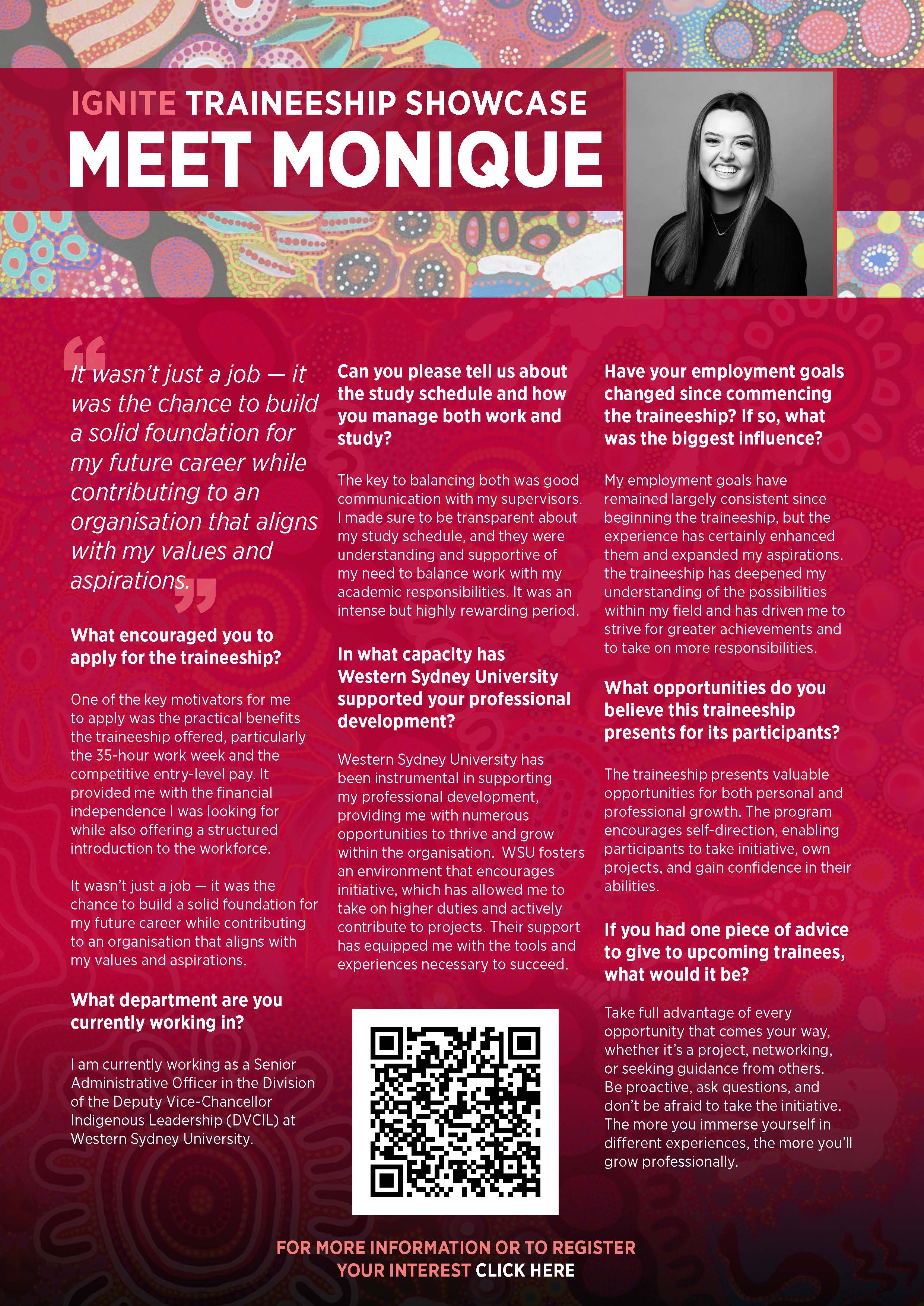 Applications for the Ignite Traineeship open every year from August. If you're interested in future opportunities outside of the application period, you can submit an Expression of Interest (EOI) through the provided link. This ensures you'll be notified when positions become availableand helps you prepare ahead of time for the application process. For more inquires or support please contact DVCIL@westernsydney.edu.au.
