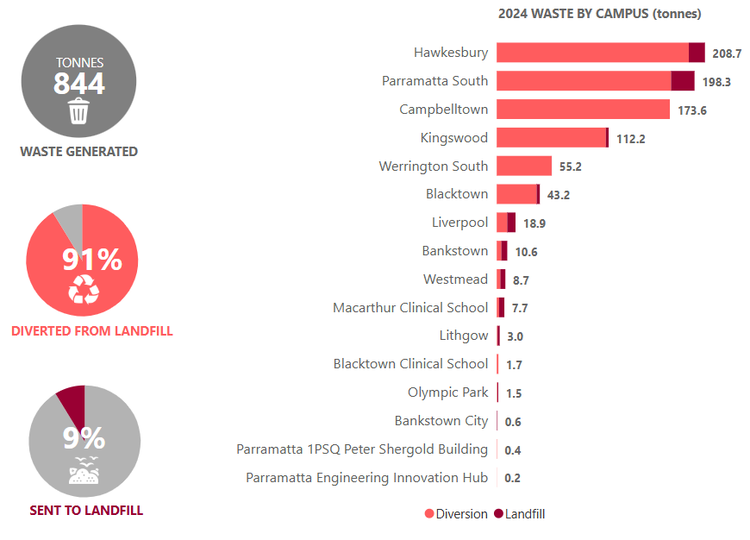844 tonnes of waste were generated in 2024, of which 771 tonnes (91%) were diverted, and 74 tonnes (9%) were sent to landfill.