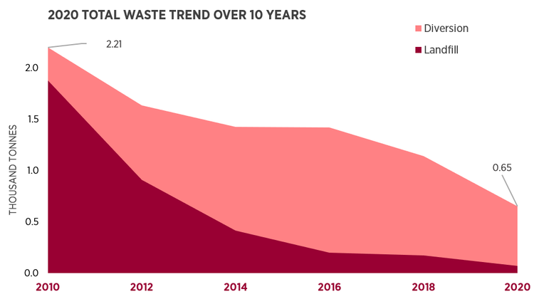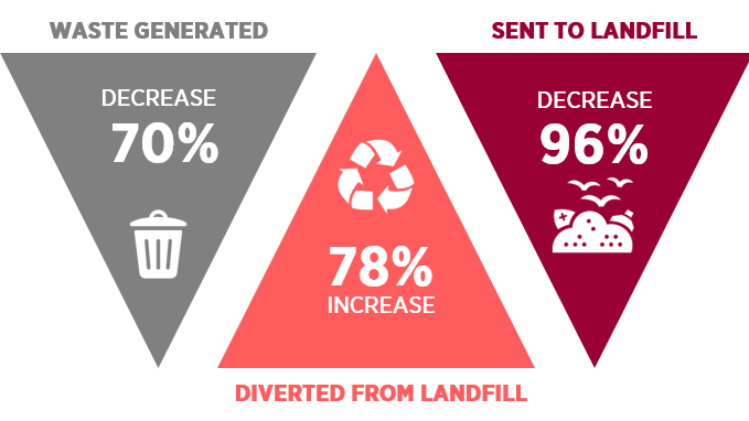 In the ten-year period overall waste generation decreased 70%, materials sent to landfill decreased by 96% and separation and diversion (recycling) of materials away from landfill increased by 78%