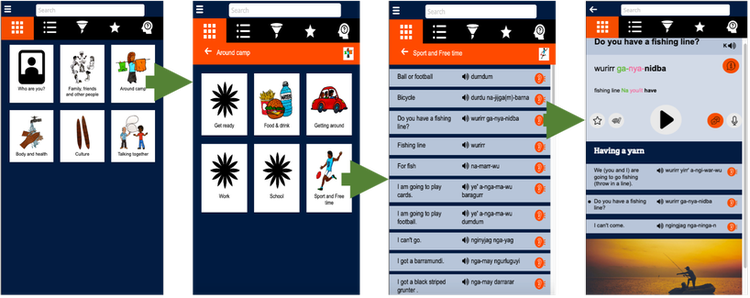 Listen N Talk is a digital shell designed to create a phrase-based language learning resource. The shell is the result of collaborative research between Jilkminggan, an Aboriginal community in the Northern Territory, Western Sydney University and app developer eLearn Australia, to develop an app to help adult community members independently learn their heritage language, Mangarrayi. In contexts such as this, where there are few opportunities to hear and learn the target language, the Listen N Talk resource provides an avenue for the valued linguistic and cultural knowledge held by older members of Indigenous communities to serve as authentic models of the language.