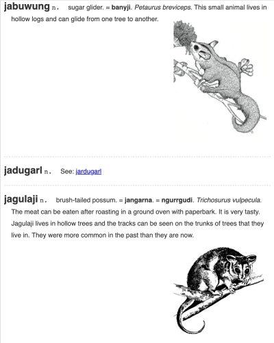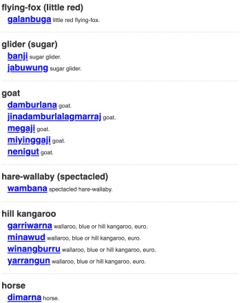 Below is a screenshot of the webpage output for mammals, in Ngarinyman language, just as an example. On the left is a snippet from the Ngarinyman-to-English output. On the right is a snippet from the English-to-Ngarinyman output where you can look up the word in Ngarinyman, starting from English: