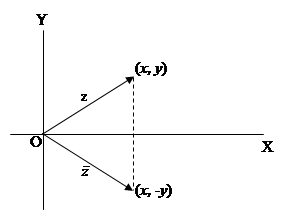 The number $\bar{z}$ is represented by the point $(x,-y)$ which is the reflection in the real axis of the point $(x,y)$ representing $z$ as shown in Fig 2.