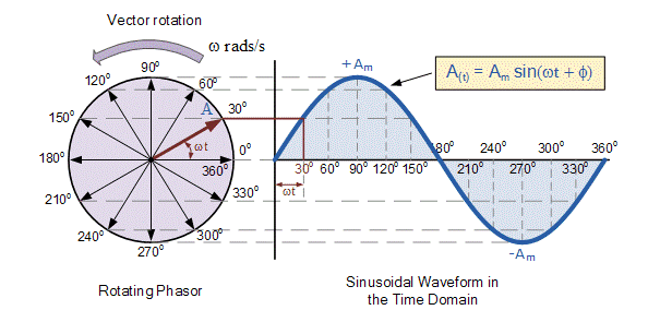 As seen from the figure above, the single vector rotates in an anti-clockwise direction and the tip point $A$ will rotate one complete revolution of $360^\circ$ representing one complete cycle. When the top of the vector is vertical, it represents the positive peak value ($+A_m$) at $90^\circ$ and the negative peak value ($-A_m$) at $270^\circ$.