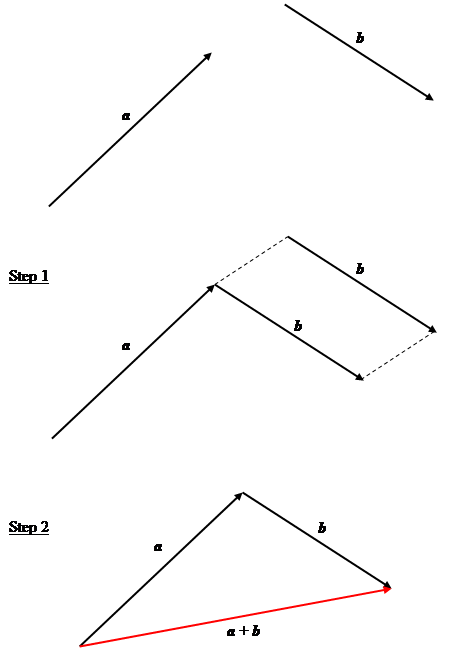 Steps showing addition of two vectors $\mathbf{a}$ and $\mathbf{b}$