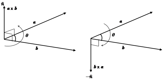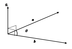 $\mathbf{\hat{n}}=$ unit vector perpendicular to both $\mathbf{a}$ and $\mathbf{b}$ whose direction is given by the right hand screw rule.