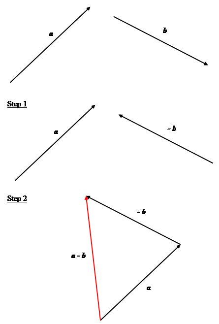 Subtraction of two vectors is performed by addition of negative vectors as shown in the figure below. For example: $\mathbf{a} - \mathbf{b} = \mathbf{a} + (- \mathbf{b})$