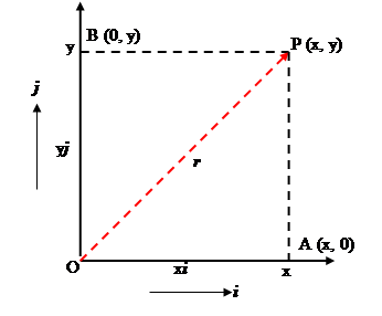 Consider the two-dimensional case as shown in the figure above. Here, two unit vectors $\mathbf{i}$ and $\mathbf{j}$ are represented as unit vectors in directions $x$ and $y$ respectively. So, $$\overrightarrow{OA}=x\mathbf{i},\quad \overrightarrow{OB}=y\mathbf{j}.$$