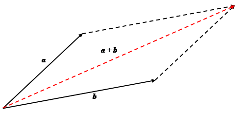 In the example given in the figure above, the sum $\mathbf{a} + \mathbf{b}$ of the given vectors $\mathbf{a}$ and $\mathbf{b}$ is given by the triangle rule. According to this rule,