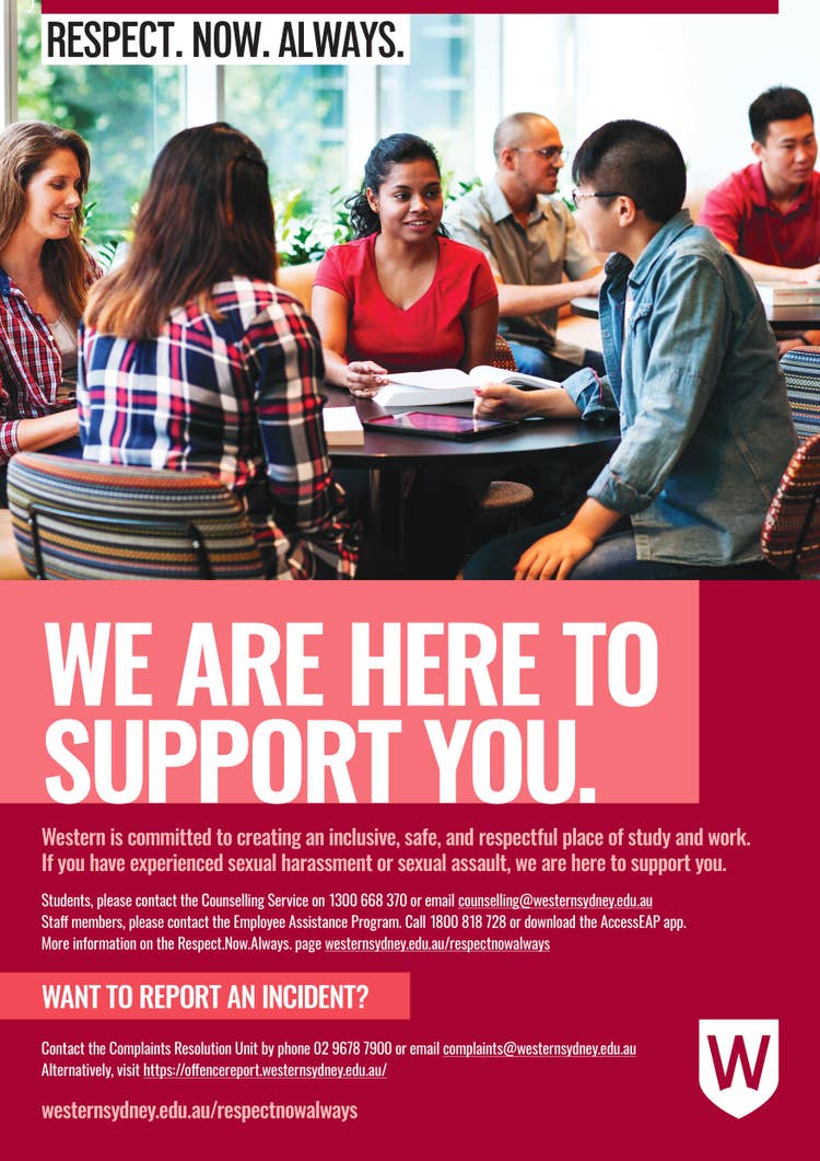 Respect Now Always and Respectful Relationships are Western's sexual harm prevention programs. We are accountable to and coordinated by our Vice Chancellor's Gender Equity and Respectful Relationships Advisory Committee.