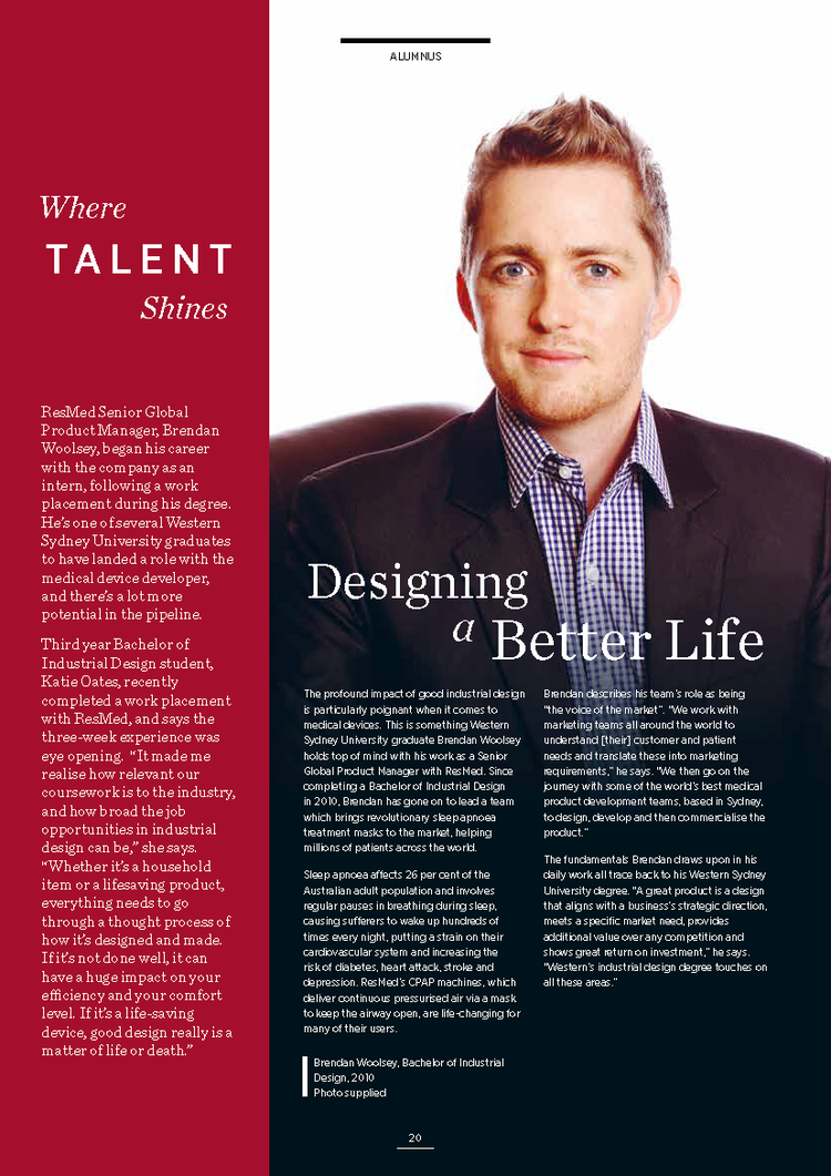 Brendan describes his team’s role as being“the voice of the market”. “We work with marketing teams all around the world to understand [their] customer and patient needs and translate these into marketing requirements,” he says. “We then go on the journey with some of the world’s best medical product development teams, based in Sydney,to design, develop and then commercialise the product.”The fundamentals Brendan draws upon in his daily work all trace back to his Western Sydney University degree. “A great product is a design that aligns with a business’s strategic direction,meets a specific market need, provides additional value over any competition and shows great return on investment,” he says.“Western’s industrial design degree touches on all these areas.”