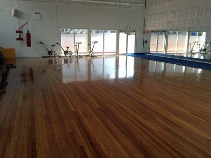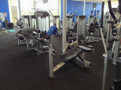 Sports gym includes equipment such as treadmills, cycle ergometers, rowers, power cage and numerous free weights and machines