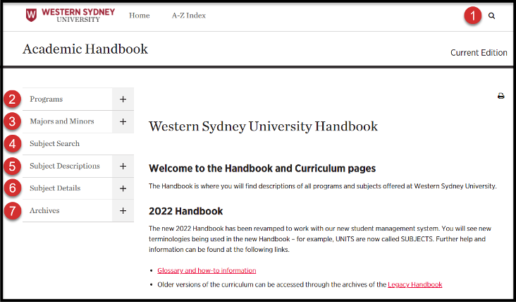 The online Handbook provides information about the programs, fields of study and subjects on offer at Western Sydney University. You might also see it referred to as the program and subject search.