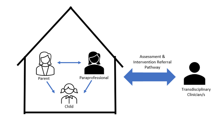 The paraprofessionals working with families will be supported by a lead professional. This may be a single transdisciplinary professional throughout the program who is the care lead and coordinator, or it may be a series of professionals related to the more significant need at the time, who coordinates care and additionally provides specialist therapy. The professional will conduct regular assessment of the family/child, refer to specialist intervention (and/or provide intervention where appropriate), and support the paraprofessional working with the family including training in maintenance of therapy within the home. This support recognizes that the provision of specialist services operates as a team around the triad (parent + child + paraprofessional).