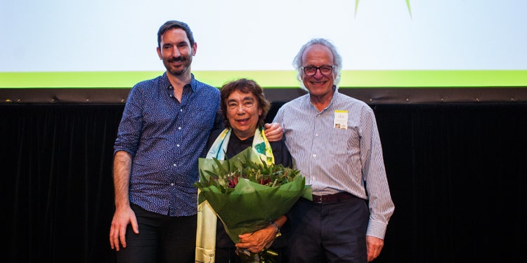 Professor Alexis Wright (centre) celebrates winning the 2018 Stella Prize for her ground-breaking collective memoir Tracker with Nick Tapper (left) and Ivor Indyk (right) of Giramondo. Photo: Connor Tomas O'Brien.